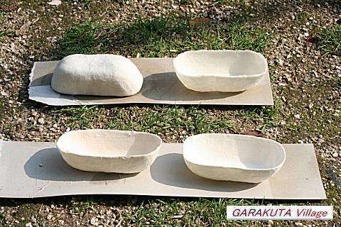 ③型を水で濡らして、ティッシュを何層(約2mm厚さ)も貼り付け、ニスを吹き付け